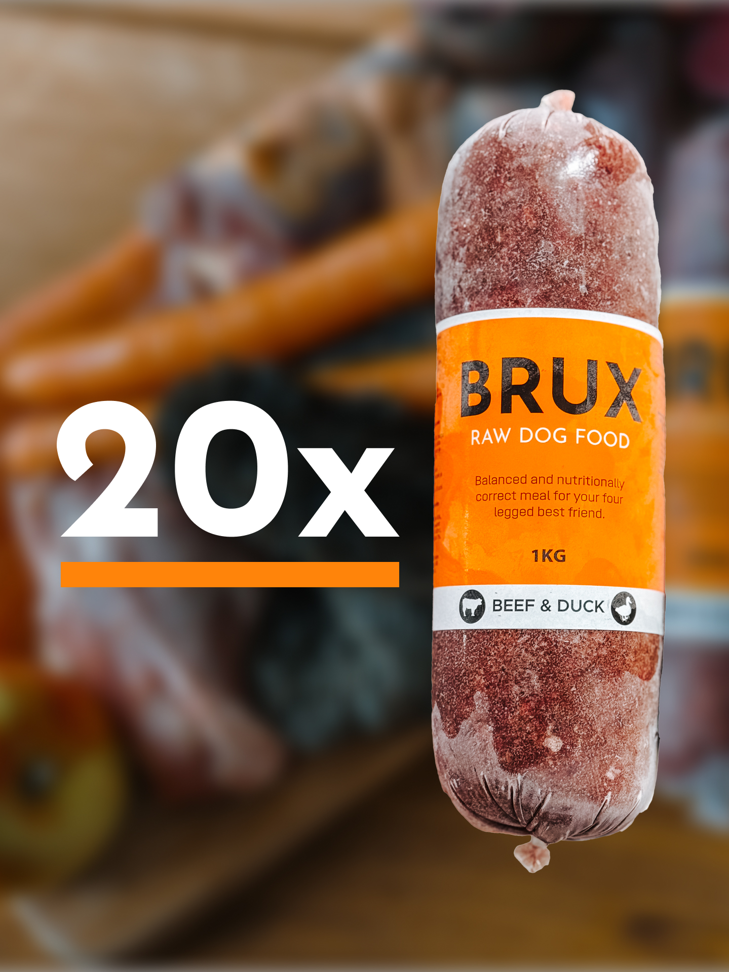 BRUX balanced raw dog food with beef and duck for all life stages.